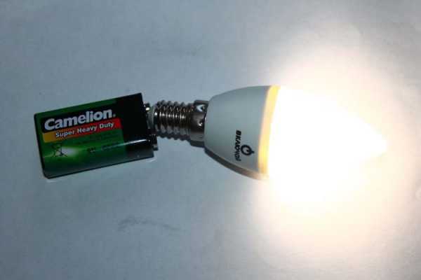 Проверяем нашу лампочку в работе, я лично сначала проверял батарейкой Крона на 9В, все исправно работало.