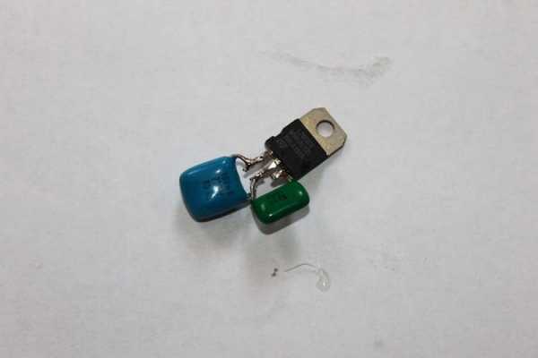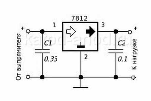 Далее нужно взять стабилизатор напряжения L7812 и два конденсатора, один на 330nF, второй-0,1мкФ. Все это спаиваем по схеме, которую я ниже приведу. Вход стабилизатора припаиваем на цоколь лампочки(плюсовой вывод входа я припаял к центральному контакту, а минусовой-к резьбовой).