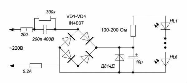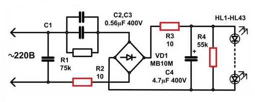 Максимально простая схема для светодиодной лампы, подключаемой к сети 220 В, включает драйвер, состоящий из двух гасящих резисторов, стабилизирующих напряжение. Подключение LED-диодов происходит в разных направлениях, что гарантирует идеальную защиту от обратного напряжения. В таком случае частота мерцания увеличивается с 50 до 100 Гц.