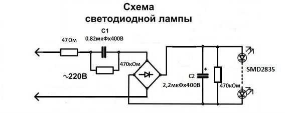 Схема платы питания светодиодной лампы не отличается особой сложностью. Деталей не много: пара резисторов и встречно-параллельное подключение диодов. Такой тип подключения позволяет защититься от обратного напряжения и увеличить частоту мерцания до 100 Гц. В некоторых лампах может быть установлен всего один резистор.