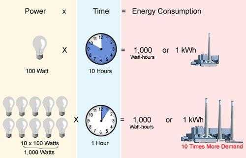 В киловатт-часах (либо в ватт-часах) измеряют потребление энергии электрическим прибором за один час работы. В качестве примера возьмем обычный компьютер с мощностью 0,65 кВт. Предположим, что он отработал один час. Как узнать, сколько электроэнергии он израсходовал за этот период? Очень просто: 0,65 кВт умножаем на 1 час работы, получаем 0,65 кВт*ч. Обычная стоваттная лампа накаливания за один час потребляет 100 Вт энергии, следовательно, за сутки беспрерывной работы она затратит 2,4 кВт. Сколько Вт в кВт, мы уже рассматривали выше.