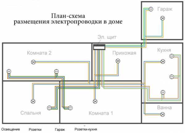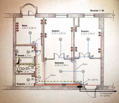 Схема разводки представляет собой такую цепь: от электрического счетчика питание подается на распределительный электрощит, с электрощита на отдельные электроприборы и электрические распределительные дозы, находящиеся в других комнатах. А от доз питание подается на розетки, выключатели и осветительные приборы.