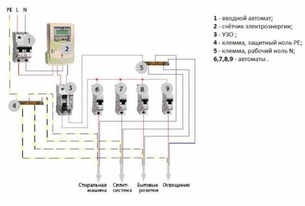 - Закрепить на стене, на высоте 2 м от пола, распределительный щит и установить на нем предохранители и счетчик.