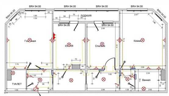 - Пути прокладки кабелей. Указывая их на своем чертеже, помните, что проводка должна идти строго вертикально либо горизонтально, никакие зигзаги не допускаются. Если планируется укладка проводов вовнутрь стен, то следует отступать от перекрытий и проемов 15 – 20 см.