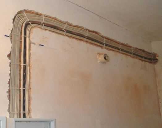 - После того, как кабель протянули во все комнаты, чтобы поменять проводку в квартире, его укладывают в штробы, из которых полностью удаляется старый провод. В случае если сделать это не удается, делают новые каналы над старыми или под ними на расстоянии 50-ти мм.