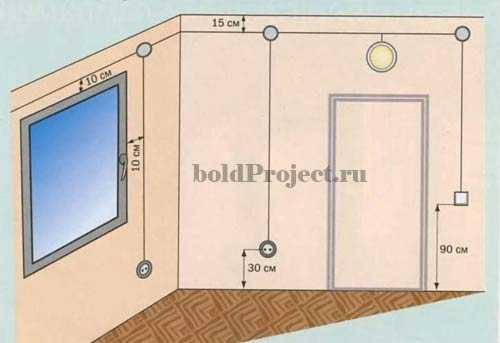- Горизонтальная укладка проводки вблизи балок и карнизов производится на расстоянии 5-10 см, от потолка — на расстоянии 15 см, а от плинтуса – от 15 до 20 см.