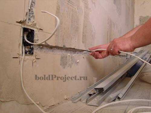 - Закрепляем электропроводку в углублениях строительными хомутами либо раствором алебастра.