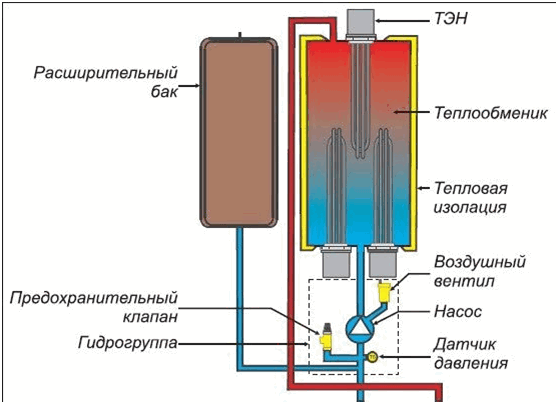 В первую очередь необходимо узнать принцип работы данного водонагревателя. Технология довольно несложная. В случае классического электрокотла теплоноситель нагревается при помощи ТЭНа. Нагрев происходит с некоторой задержкой, так как период от включения до начала работы обычно длительный. Работает такой котел по определенному принципу: маленькие трубы, которые служат проводником для теплоносителя, способствуют разогреванию ТЭНа и отопительной системы.