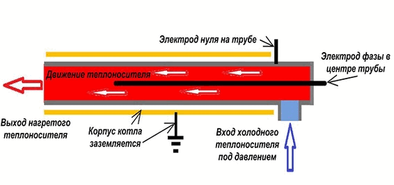 Электродные котлы имеют свой принцип работы. ТЭН в данном случае не используется, а вместо него в трубах устанавливается один и три электрода. Количество элементов зависит от вида котла (однофазный или трехфазный). Когда данная конструкция подключена к питанию, в трубе начинает происходить обмен ионов, при котором нагревается теплоноситель. Как результат,