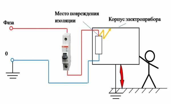 На первой из них изображен случай поражения человека электрическим током, которое происходит в результате прикосновения к незаземленному корпусу электроприбора с нарушенной изоляцией. В этой схеме имеется автоматический выключатель, разъединяющий свои контакты в случае возникновения тока перегрузки или короткого замыкания, но такая защита не срабатывает при замыкании фазы на землю.