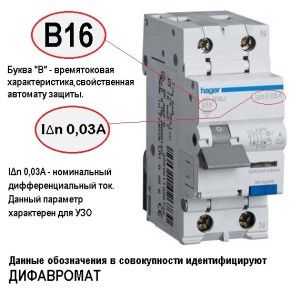 На изображении обозначения «В16» и «IΔn0,03A» выделены красными овалами. Буква «В» — время-токовая характеристика, свойственная автомату защиты. «IΔn0,03A» — номинальный дифференциальный ток. Данный параметр характерен для УЗО. Данные обозначения в совокупности идентифицируют дифавтомат.