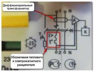 - У дифавтомата в принципиальной схеме, нанесенной на его корпус, поставлены два дополнительных выключателя, обозначающих тепловой и электромагнитный расцепители.