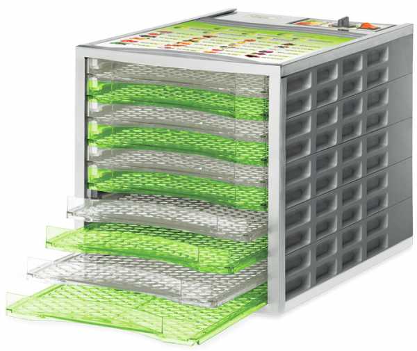 Одна из самых вместительных и мощных сушилок этого производителя. Количество поддонов – 8, их можно доставать, что способствует компактному хранению и возможности регулировать массу продуктов для сушки.