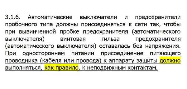 Однако традиционно, ещё со времён рубильников, монтаж вёлся сверху вниз. Электромонтёры, отключая автомат, ожидают, что на проводах, находящихся ниже него, напряжение отсутствует. В ПТБ (правилах техники безопасности) в п.4.1.1 сказано, что после отключения автоматического выключателя перед началом работ необходимо проверить отсутствие напряжения, но многие электрики этим правилом пренебрегают. Поэтому везде, где это возможно, напряжение следует подключать к верхним клеммам.