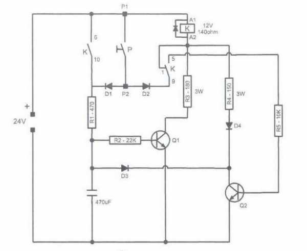 Как показывает опыт, некоторые экземпляры 24-вольтовых реле удерживаются в положении с притянутым якорем при снижении напряжения питания до 5 В. С помощью этой схемы можно включать до 4 катушек реле параллельно. Применение такой схемы включения реле, вдобавок, увеличивает экономичность устройства, в котором имеются реле, поскольку снижает нагрев катушек реле.