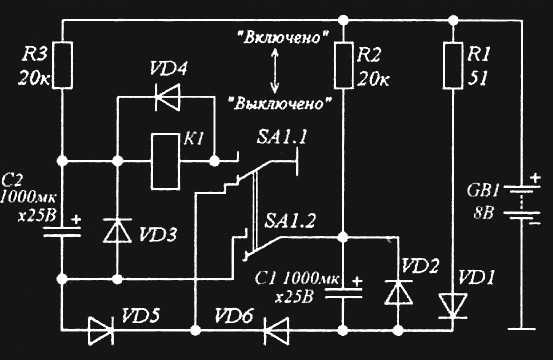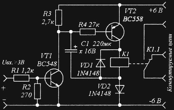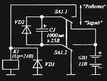 После разряда С1 напряжение на реле снижается до 6 В, которого, однако, достаточно для поддержания его в рабочем (включенном) состоянии. Диод VD2 в момент включения заперт напряжением заряженного конденсатора С1, который подключается через открытый транзистор параллельно ему, но в обратной полярности, препятствуя прохождению тока через диод. Получается, что эта цепь питания реле разорвана практически до полного разряда С1. По мере разряда С1 напряжение на нем стремится к нулю, диод VD2 открывается и обеспечивает ток удержания реле при напряжении питания 6 В. Диод VD1 — защитный. Он осуществляет защиту транзистора VT2 от бросков напряжения самоиндукции, возникающего при переключении реле К1.