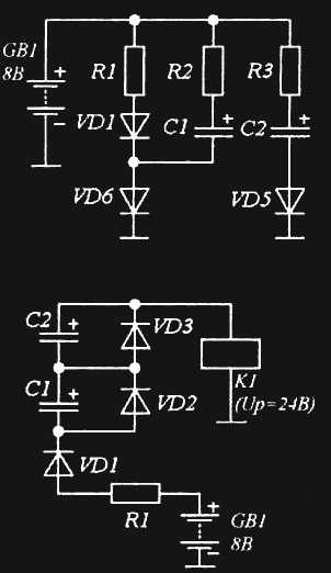 В принципе, реле можно питать и еще более низким напряжением, например, составляющим 1/3 от номинального [3]. На рис.3 приведена схема такого устройства. В положении SA1 “Выключено" от батареи GB1 напряжением 8 В через резисторы R2, R3 и диоды VD2, VD3 заряжаются одновременно два конденсатора С1 и С2. Эквивалентная схема для режима заряда показана на рис.4. Следует учесть, что заряд конденсаторов в этой схеме продолжается примерно минуту. При переводе тумблера в положение “Включено” напряжения с двух заряженных конденсаторов складываются с напряжением питания (8+8+8=24 В), и реле с Uр=24 В срабатывает. Эквивалентная схема для этого режима приведена на рис.5. Примерно через минуту конденсаторы разряжаются, но якорь реле остается притянутым, так как напряжение питания будет приложено к обмотке реле через диоды VD1, VD2 и VD3.