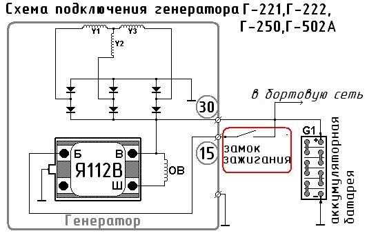 На схеме генератора мы видим три силовые обмотки Y1, Y2,Y3, в которых и генерируется переменный ток, и трехфазный силовой выпрямитель, который преобразует переменный ток в постоянный. Но на выводах силовых обмоток напряжения не будет, если не подключить постоянное напряжение от аккумулятора на обмотку возбуждения. По схеме это осуществляется через замок зажигания на вывод 15 генератора и клемму “Б” реле регулятора. Через клемму “Ш” реле регулятор в нужный момент соединяет другой вывод обмотки возбуждения с массой (т.е. минусовым проводом аккумулятора). Обмотка возбуждения расположена на роторе генератора и является электромагнитом постоянного тока. При вращении ротор создает вращающееся электромагнитное поле, которое пересекает проводники неподвижных силовых обмоток статора и индуцирует в них переменный ток с частотой вращения ротора.