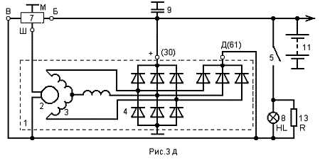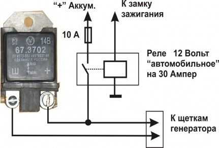 В некоторых случаях в выключателе зажигания падает напряжение, оказывая влияние и на регулятор. Из-за этого возможны колебания стрелок приборов, мигание осветительных и сигнальных ламп. Чтобы избежать подобных ситуаций применяется более перспективная схема реле-регулятора напряжения. К обмотке возбуждения дополнительно подключен выпрямитель, в состав которого входит три диода. Плюсовой вывод выпрямителя соединяется с обмоткой возбуждения. Аккумуляторная батарея на стоянке разряжается под действием малых токов, проходящих через цепь регулятора.