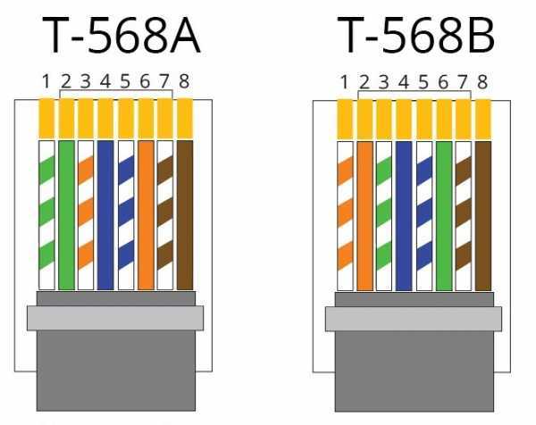 T-568A и T-568B — это два стандарта проводки для кабеля данных разъема RJ-45, указанного в документе по стандартам электропроводки TIA / EIA-568-A. Разница между ними — это расположение оранжевых и зеленых проводов. Предпочтительно подключать стандартам T-568B, так как этот стандарт имеет большую популярность и распространенность.