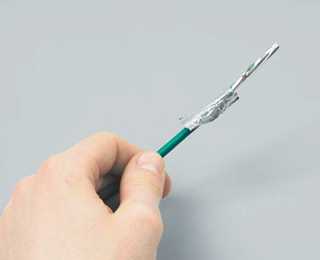 | 5. Срежьте ножницами лишнюю часть оболочки с фольгой, оставив около 1,5 см. | 6. Накрутите на фольгу дренажный провод, который страхует кабель от разрывов фольги и обеспечивает электрическую непрерывность экрана. |