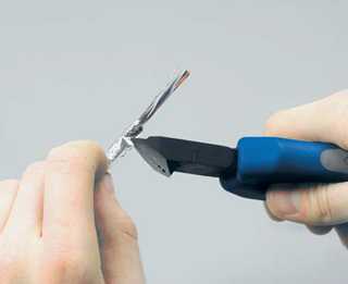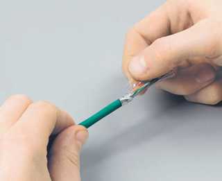 | 7. Удалите защитную ленту. | 8. Чтобы поместить кабель в разъем, требуется расплести пары. Пары развиваются вплоть до края оболочки кабеля, которому придается плоская форма, чтобы было удобно расположить пары в один ряд. |