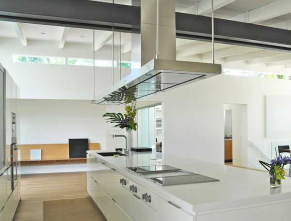 - Островные. Монтируются к потолку на кухнях, где рабочая зона представлена в виде «островка» в любом месте помещения (зачастую по центру).