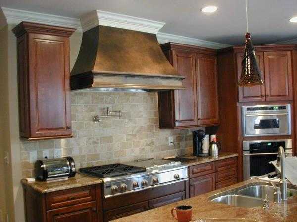 - Купольные вытяжки наиболее распространены в наши дни. Такая вытяжка крепится над плитой. Материал отделки может быть самым разным, выбор просто огромен.
