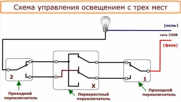 В случае управлением освещением из трех точек, проходные выключатели ставят в начале переключающей цепи и в конце, а перекрестный выключатель — между ними. Это можно посмотреть на стандартной схеме, как подключают перекрестный и проходные переключатели.