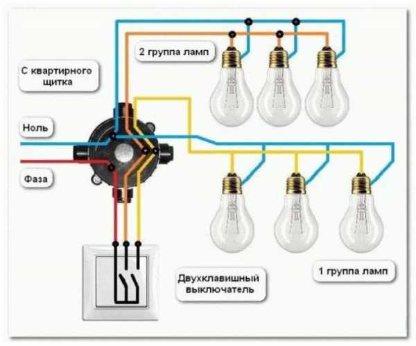 При управлении люстрой двухклавишным выключателем, схема несколько меняется, разница лишь в том, что из выключателя возвращается не один, а два фазных провода, которые попарно соединяются с фазными проводами люстры.