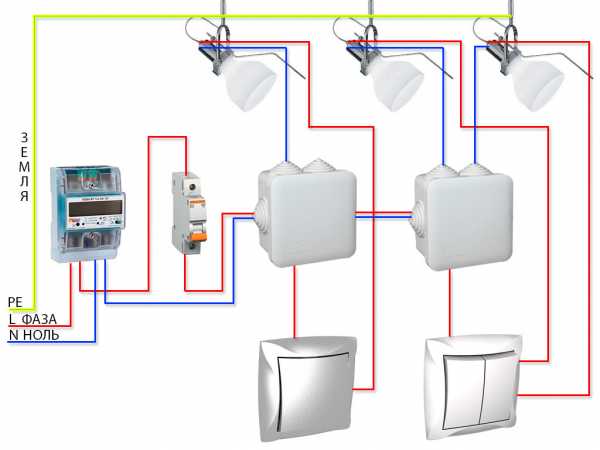 - К каждому осветительному прибору подводится трехжильный кабель: нулевой провод, заземление и фаза.