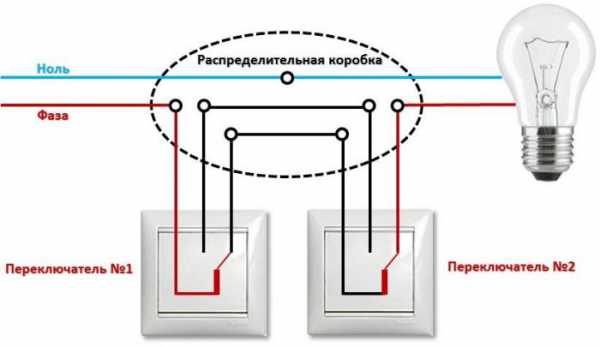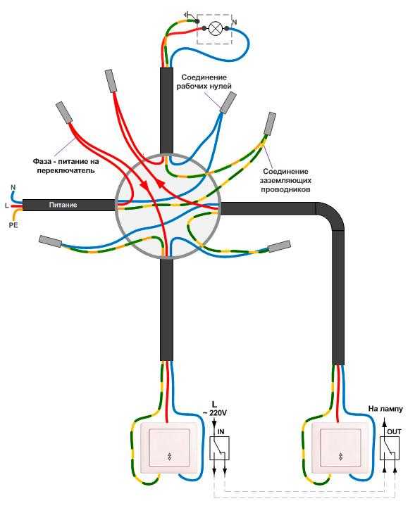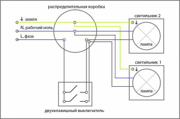 Схема подключения двухклавишного выключателя с подключением через распредкоробку