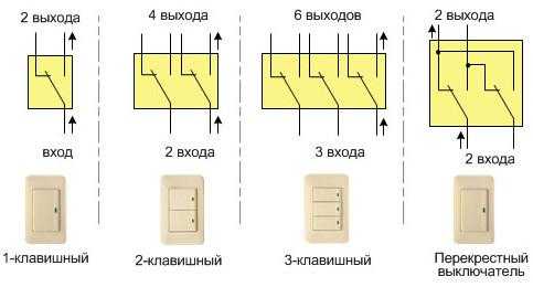 В отличие от одиночных выключателей, которые имеют 2 выхода и 1 вход, двухклавишные имеют 4 выхода и 2 входа. Количество проводов растет прямо пропорционально количеству клавиш, поэтому трехклавишные используются очень редко из-за сложности такой электросхемы.