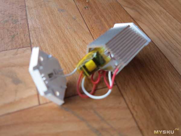 Лампочки этого типа сравнительно дорогие, но сделаны качественно. Отвернул по два винта и сняв боковые стенки, предъявляю по традиции внутренности. Достать полностью не позволяют провода. Отчётливо видно трансформатор и электролитический конденсатор. Основание, алюминиевый каркас из профиля, сбоку пластмассовые стенки с контактом и прорезями для вентиляции, внутри схема в плёнке, провода все силиконовые. Платы с диодами охлаждаются об алюминиевый каркас.