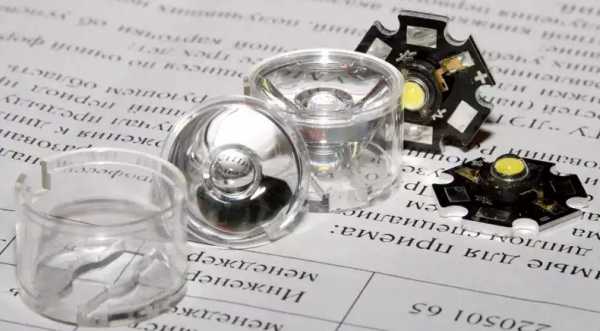 Устройство прожекторов немыслимо без отражателей и линз. Оба этих оптических прибора служат для формирования определенного угла светового потока, получаемого мощными светодиодами. Правильно подобранная оптика максимально увеличит эффективность и плотность светового потока. Вся имеющаяся оптика подразделяется на линзы и на отражатели для светодиодов.
