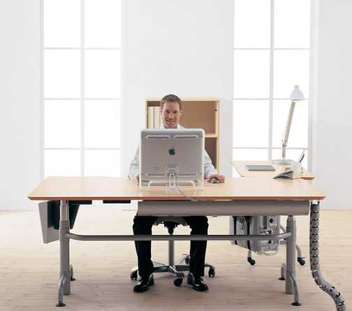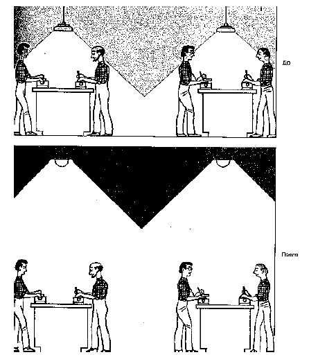 - Правильный свет падает ровно сверху. Если он будет падать из-за головы работника, то будет создаваться тень, если будет бить в лицо, то будет создавать слепящий эффект. Поэтому при таком типе местного освещения столы должны иметь покрытие, максимально поглощающее свет, дабы не создавать бликов.