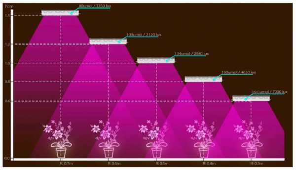 При размещении светильников полезно знать, что если расстояние до лампы увеличить в два раза, то интенсивность света на растении уменьшится в четыре раза.