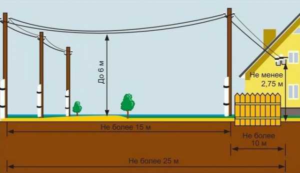 Кабель прокладывается от линии электропередач до дома воздушным путем (подземный не допускается). Этот способ считается удобным быстрым и малозатратным.