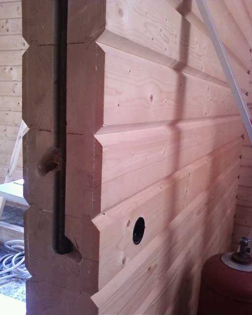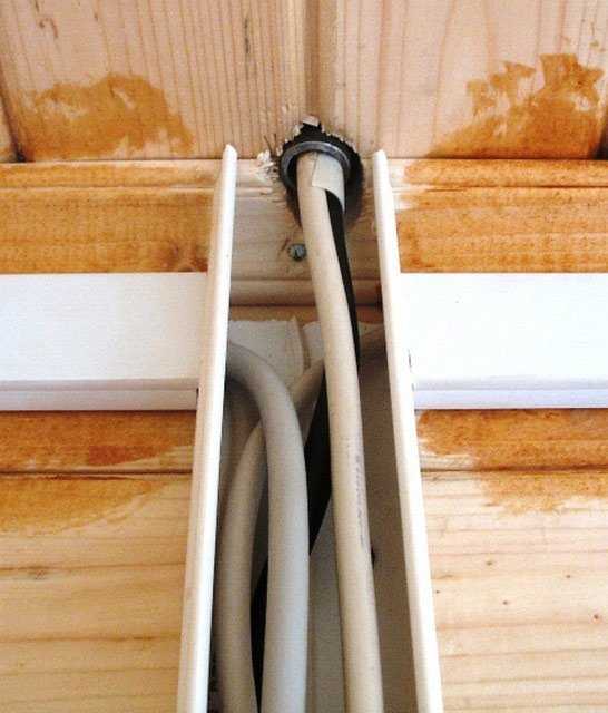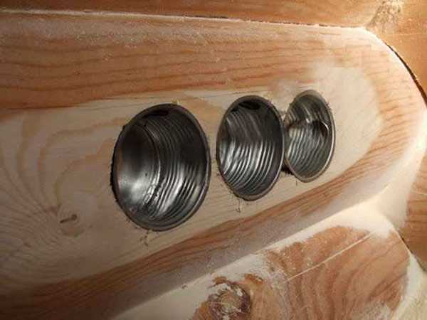 Протяжка проводов сквозь деревянные стены делается только через металлические трубы (проходные гильзы). Гофрированные трубы не подходят, так как легко повреждаются. Стены просверливаются, и гильзы в отверстия вставляются так, чтобы их края немного выступали над стеной. На гильзы надеваются пластиковые насадки, они защищают провода от повреждений. Затем выступающие концы гильзы помещают в короба.