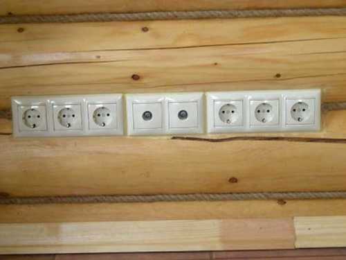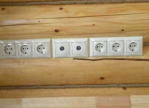 - При установке розеток и выключателей в деревянном доме следует думать о пожаробезопасности. Поэтому обязательно на месте где будут они размещаться, устанавливают металлические пластины. На глазомер лучше не полагаться при такой работе, лучше воспользоваться уровнем.