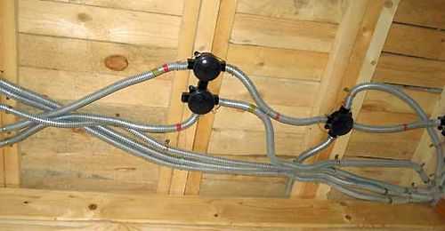 Все трубы из металла соединяются между собой или с коробками при помощи сварки или резьбового соединения. Получается что вся работа электромонтажа в деревянных домах очень трудоемкая и затратная по материалам.Гораздо проще можно проложить с использованием металлорукава. В итоге и у Вас получится так, как показано на картинке.
