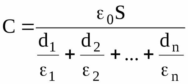 Электроемкость плоского конденсатора, заполненного n слоями диэлектрика толщиной di и диэлектрической проницаемостью i каждый (слоистый конденсатор), составляет