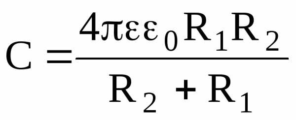 Электроемкость сферического конденсатора (две концентрические сферы радиусом R1 и R2 , пространство между которыми заполнено диэлектриком с диэлектрической проницаемостью ) находится так: