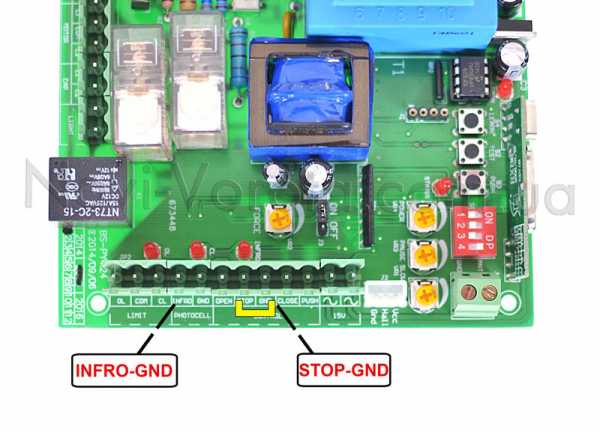 У платы есть две перемычки. Перемычку «INFRO-GND» нужно снять, а «STOP-GND» оставить.