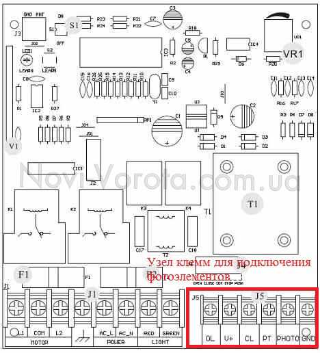 На фото показан узел, где расположены клеммы, предназначенные для фотоэлементов.