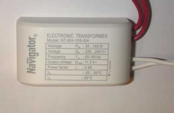 Чтобы решить эту проблему, в наш век высоких технологий были разработаны и внедрены в жизнь электронные трансформаторы, которые по более строгой классификации являются электронными блоками питания. Эти устройства содержат преобразователь, увеличивающий частоту питающего напряжения от 10000 до 30000 Гц, за счет чего размер трансформатора и был уменьшен. Убедиться в этом поможет представленное ниже изображение трансформатора этого вида.