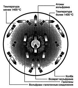Вылетающие с раскаленной спирали атомы вольфрама не долетают до стенок колбы (за счет чего и снижается почернение лампы), а возвращаются обратно химическим путем. Это явление получило название галогенного цикла. Ниже представлено графическое изображение данного процесса.