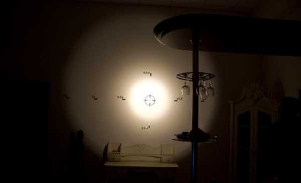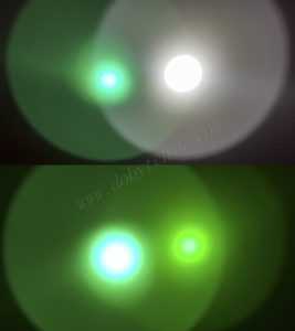 На фотографиях ниже видно как меняется цвет луча и его яркость при использовании зеленого светофильтра. Яркость существенно падает, и кроме этого, свет приобретает зелено-желтый оттенок (световое пятно снизу справа).