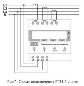 Подключение и настройка РТН-2. Подключение и настройку РТН-2, должен производить персонал имеющий допуск до 1000В. Регистратор напряжения и тока в трехфазной сети РТН-2 необходимо установить на DIN-рейку. Подключение контролируемых линий производят через винтовые клеммные разъемы, сечением провода не менее 0,75 мм.кв. К клеммам L1, L2, L3 (фазы) и N (общая нейтраль) подключают вводы линий для контроля напряжения. К клеммам ТТ1, ТТ2 и ТТ3 подключаются вводы линий для контроля тока нагрузки ( см. Рис.1).