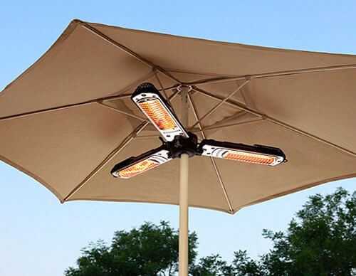 AZ Patio Heaters Electric Patio Heater, Parasol имеет мощность в 1500 Watts и контролируемый температурный режим. Такой обогреватель надежно крепится под купол зонтика и способен обогреть до 1,5 м2 - за счет 3 ламп! В добавок эта модель водонепроницаема и снабжена защитой от падения. Тепло, светло и уютно - идеальная атмосфера для душевных разговоров за ~$80.